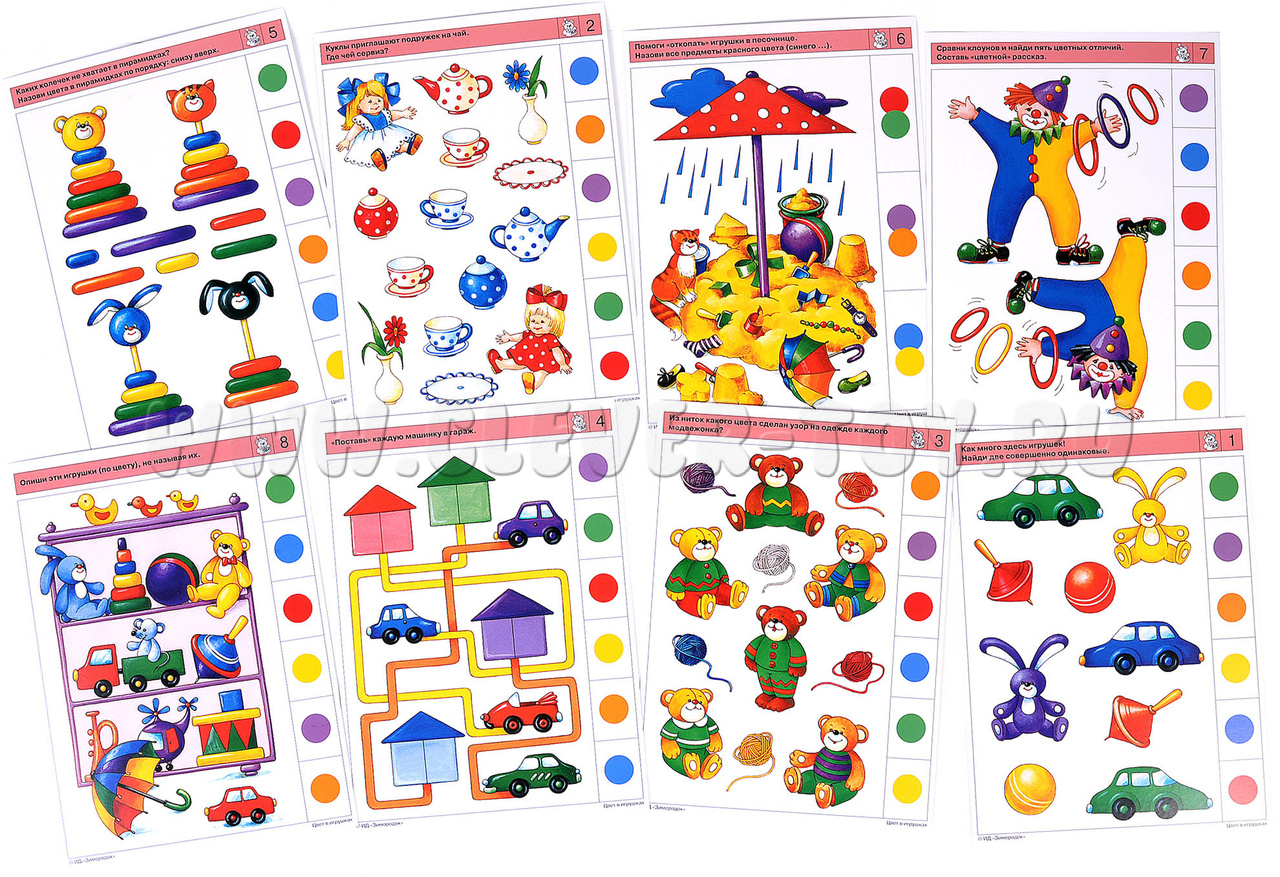Первое знакомство ребёнка с цветом. Задания комплекта научат малыша узнавать, различать и называть цвета, выбирать целое изображение заданного цвета или его части (цвет мишки и отдельно цвет шапочки на нем), сравнивать изображения по цвету между собой и группировать их по этому важнейшему признаку. Примеры заданий в карточках: 1а. Покажи такую же игрушку, только маленькую. Назови цвет каждой игрушки. 2а. «Завяжи» куклам бантики. Подбери подходящие по цвету ленточки. 3б. Из ниток какого цвета сделан узор на одежде каждого медвежонка 4б. «Поставь» каждую машинку в гараж. 8а. Помоги собрать игрушки. Все игрушки в коробке должны быть разного цвета.