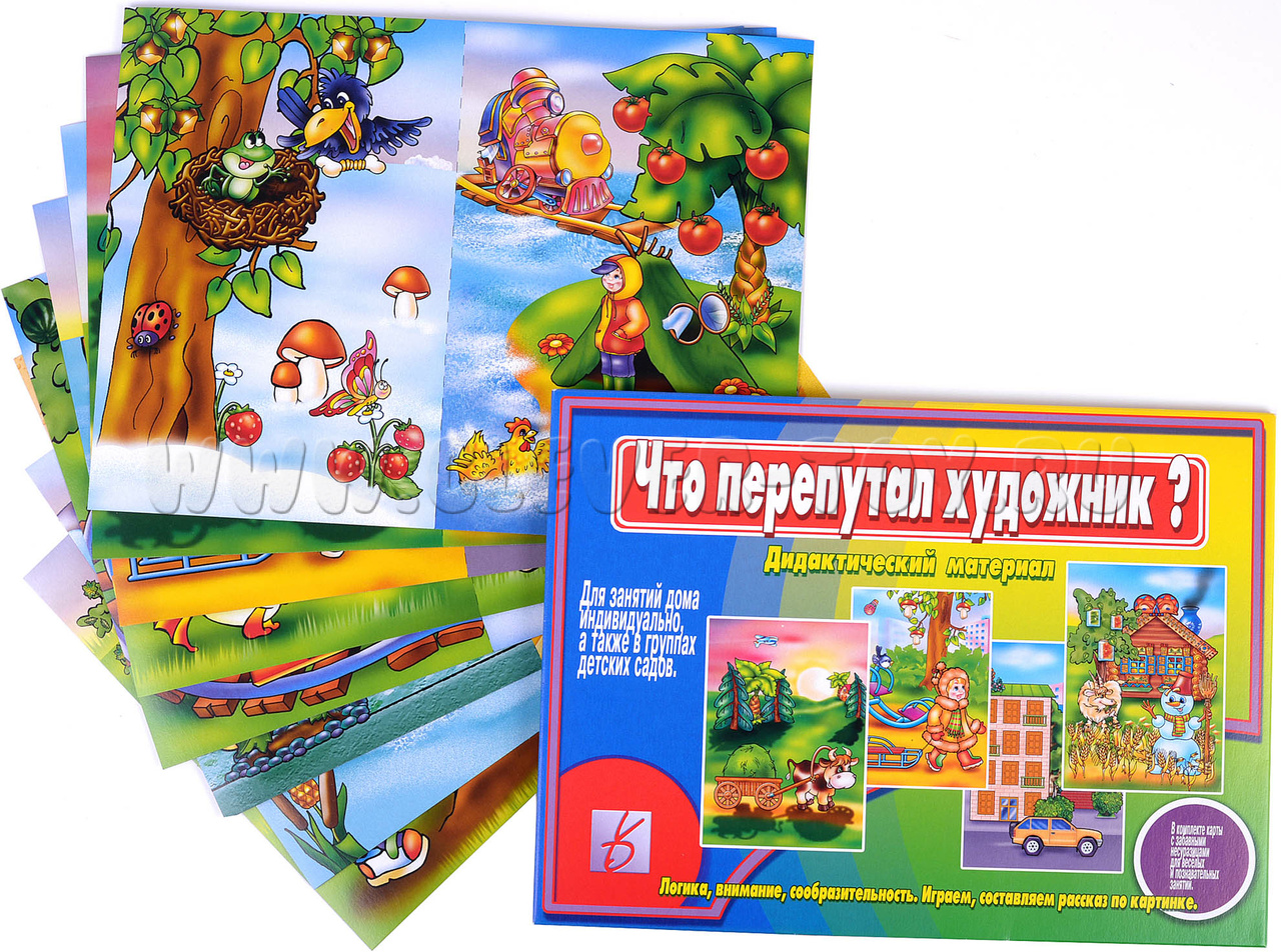 Игра состоит из 16 сюжетных картинок (по 2 изображения на листе А4). Ребенку предлагается найти и исправить допущенные художником ошибки, аргументировать свой ответ, придумать к картинке небольшой фантастический рассказ, дав волю воображению.