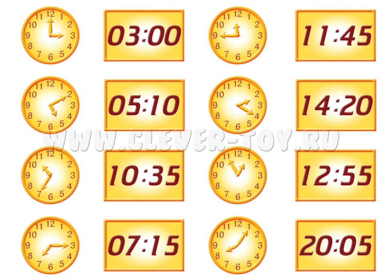 - Часы. Ребенок определяет время на карточках с механическими часами, подбирает к ним картинки с электрическими часами.