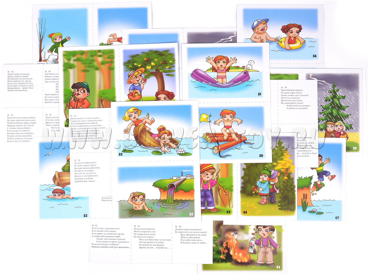 - Раздайте детям поровну картинки-иллюстрации. Начните зачитывать стихотворения. Игрок, чья картинка соответствует содержанию стихотворения, забирает карточку с ним себе и объясняет, как избежать опасной ситуации и выйти из нее, если ситуация все же случилась;