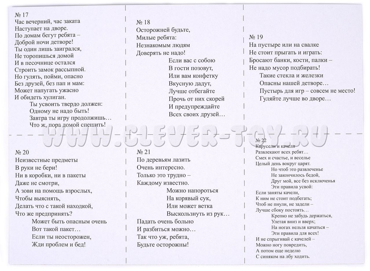 Дидактический материал поможет детям развить логическое и аналитическое мышление, мелкую моторику рук и зрительно-моторную координацию. Игра рекомендована для занятий с детьми от 5 до 9 лет и включает в себя 15 карт формата А4: 22 сюжетные картинки и 22 небольших стихотворения – по одному на каждое правило. Перед началом занятия родителю или педагогу необходимо разрезать карты по пунктирным линиям. Играть можно несколькими способами: