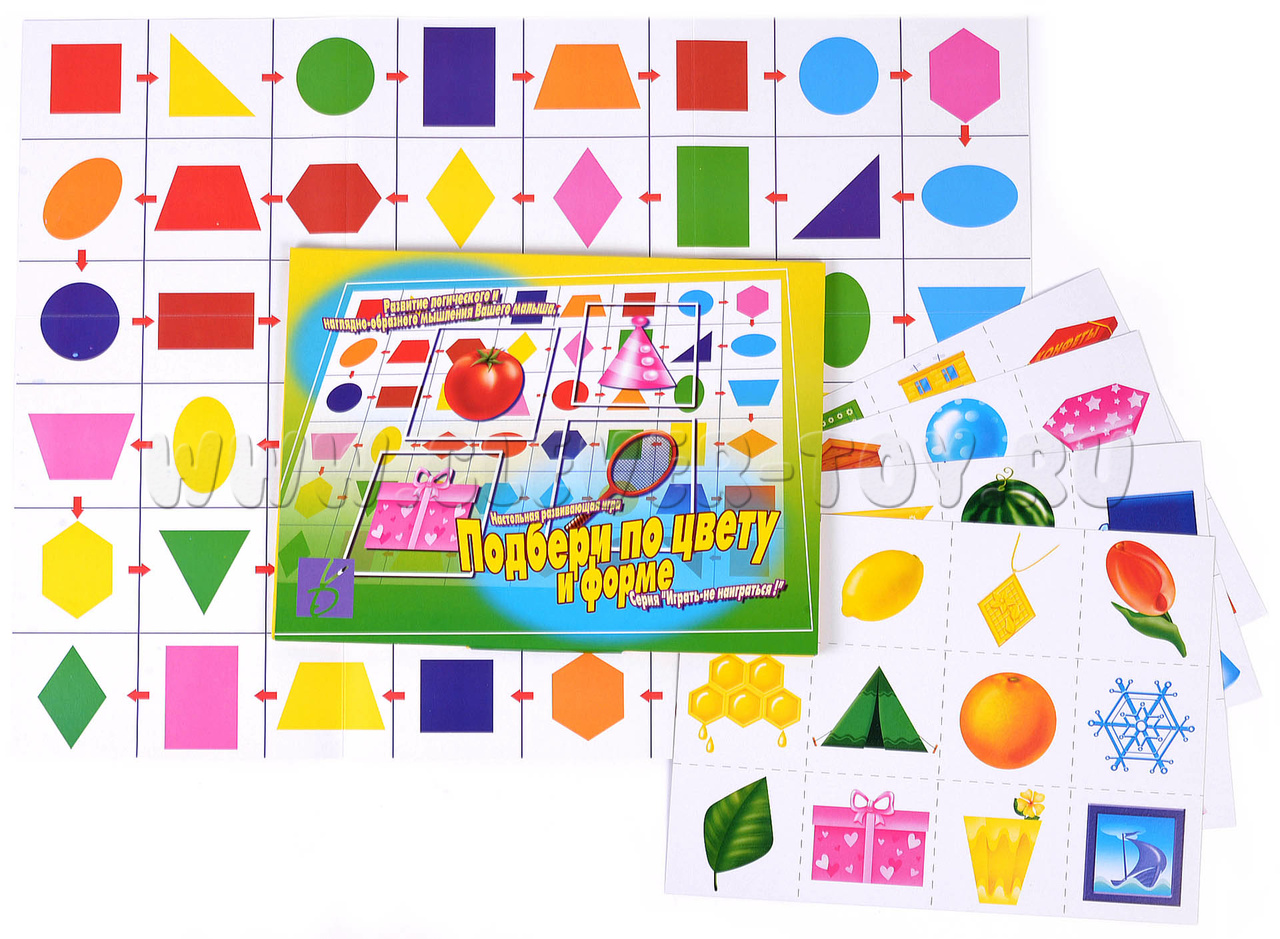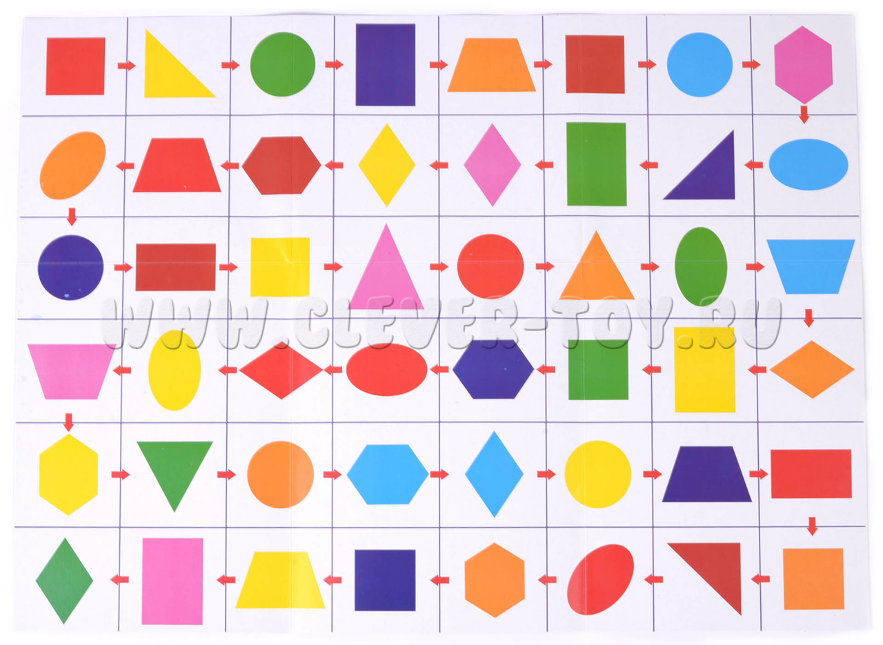 Игра включает в себя большое игровое поле и 4 разрезных карты с предметами разных форм и цветов. Перед началом игры разрежьте карты по пунктирным линиям. Получится 48 карточек с картинками. Карточки перемешайте и раздайте участникам поровну. Игроки должны выложить свои карты стопкой картинками вниз. Случайным образом выбирается тот, кто начинает игру. Начинающий берет верхнюю карточку из своей стопки и проверяет, подходит ли предмет на его карточке по цвету или форме к первой клетке игрового поля. Если да – карточка выкладывается на клетку поля, если нет – карточку откладывают в сторону. Следующий участник поступает аналогичным образом со следующей клеткой поля. Участник имеет право на ход вне очереди, если фигура на его карточке подходит к фигуре на поле и по цвету, и по форме. Если у игрока в стопке закончились карточки, он может использовать те, что были отложены в сторону. Если подходящей карточки нет, участник пропускает ход. Побеждает тот, кто первым выложит все свои карточки на игровое поле.