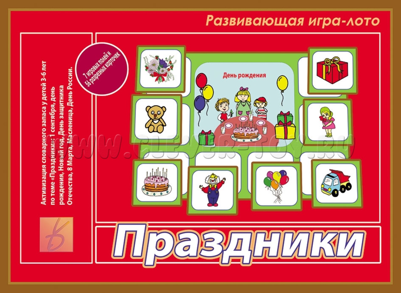 "Праздники" – развивающая игра-лото для детей в возрасте от 3 до 6 лет, основная цель которой – активизация словарного запаса детей по теме "праздники". В этом помогут игровые поля и разрезные картинки, связанные с такими праздниками, как 1 сентября, день рождения, Новый год, День защитника Отечества, 8 Марта, Масленица и День России.