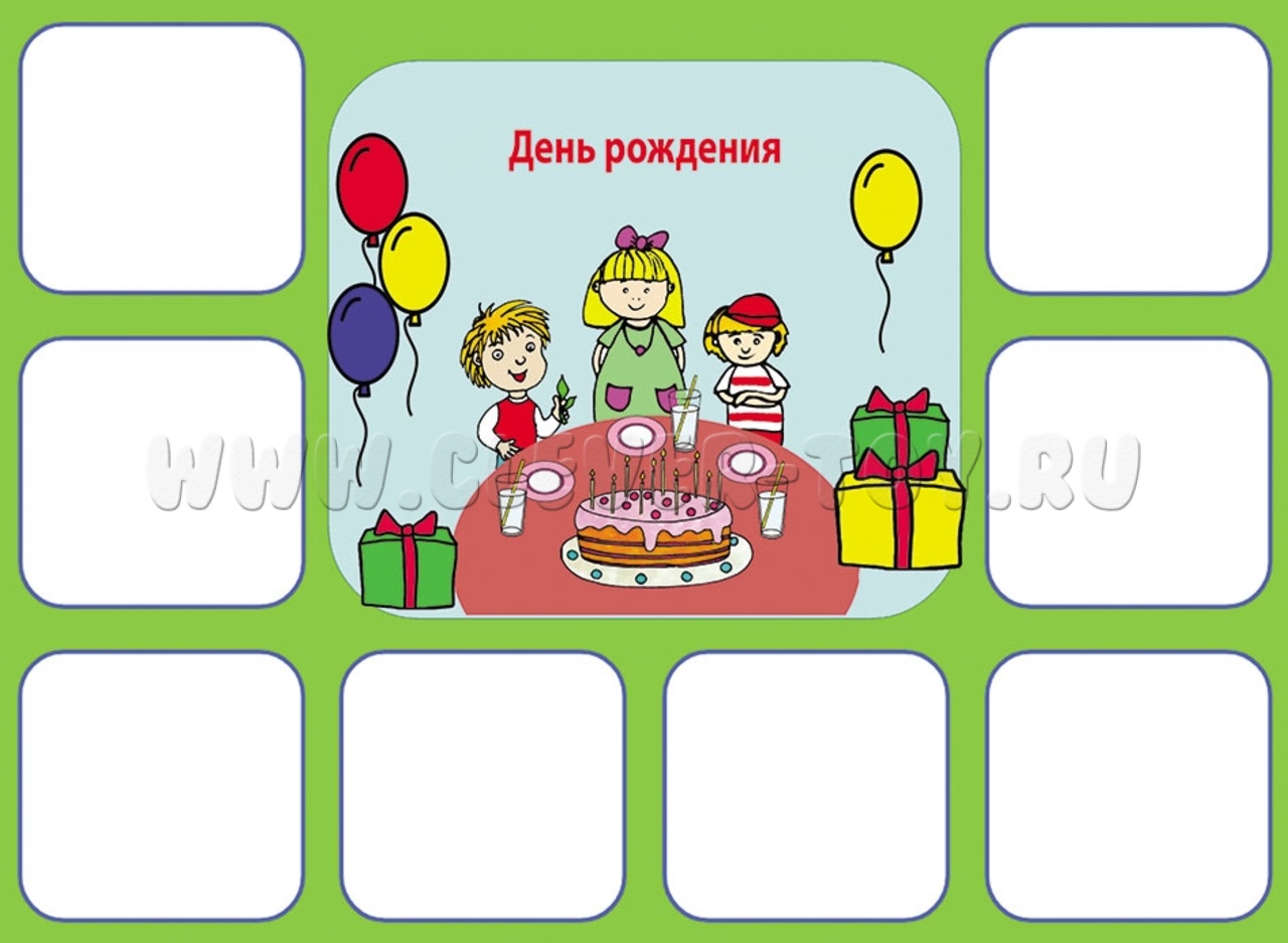 1. Выложите перед ребенком пустое игровое поле и стопку карточек. Предложите малышу назвать праздник, который он видит в центре игрового поля, рассказать, в какое время года его празднуют, что ребенок о нем знает. После предложите малышу подобрать к празднику карточки с картинками, которые ассоциируются с этим праздником;