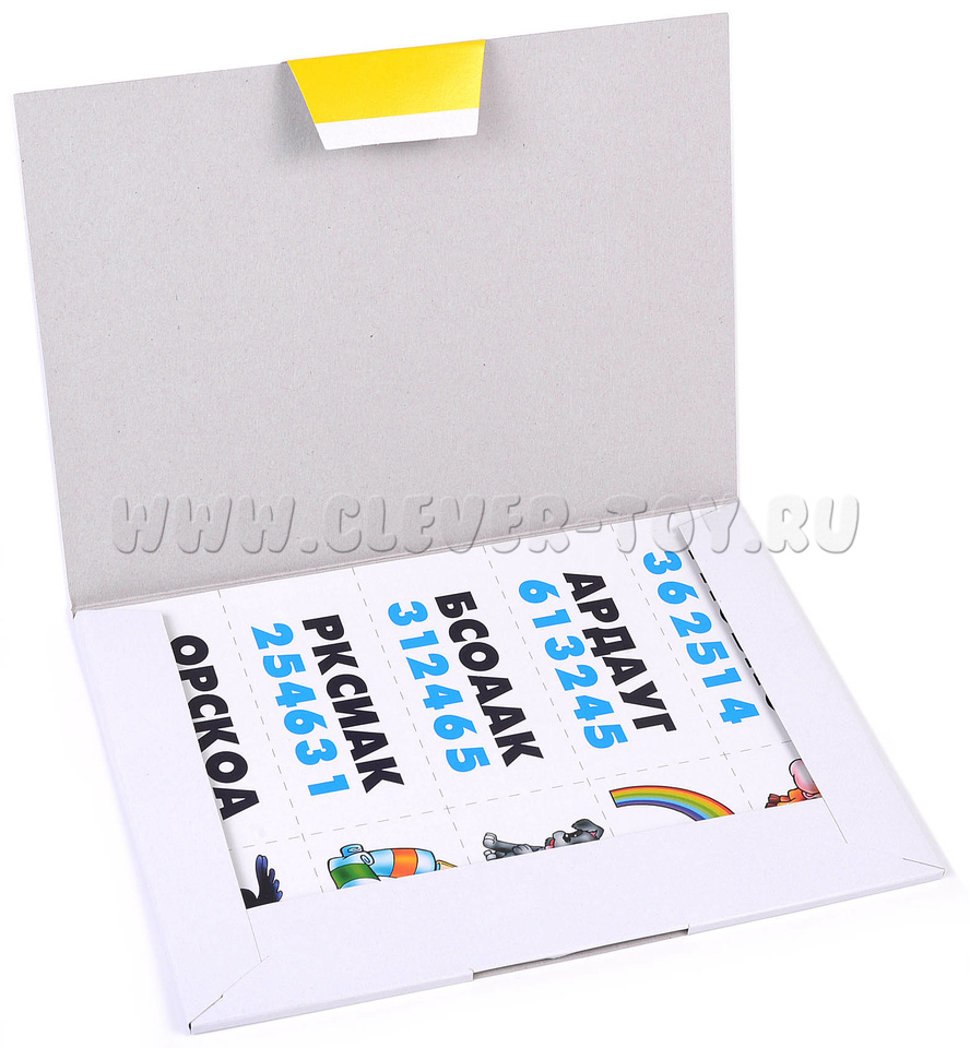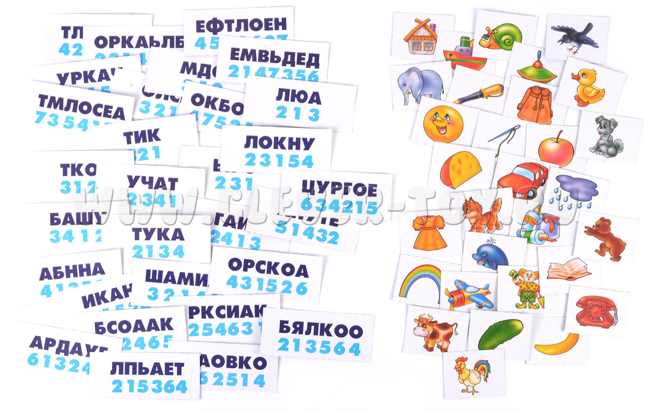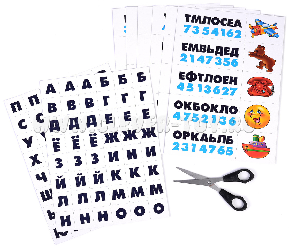 В наборе 8 карт формата А4: 30 картинок с заданиями (задание – слово, которое необходимо расшифровать) и 96 карточек с буквами. Перед началом игры родителю или педагогу необходимо разрезать карты по пунктирным линиям. Предложите ребенку прочитать слова на карточках. Для этого буквы небходимо расположить по порядку (ориентируйтесь на цифры). Когда слово будет расшифровано, предложите ребенку подобрать к нему подходящую картинку с изображением предмета. Слова можно не только читать, но и выкладывать, используя карточки с буквами.