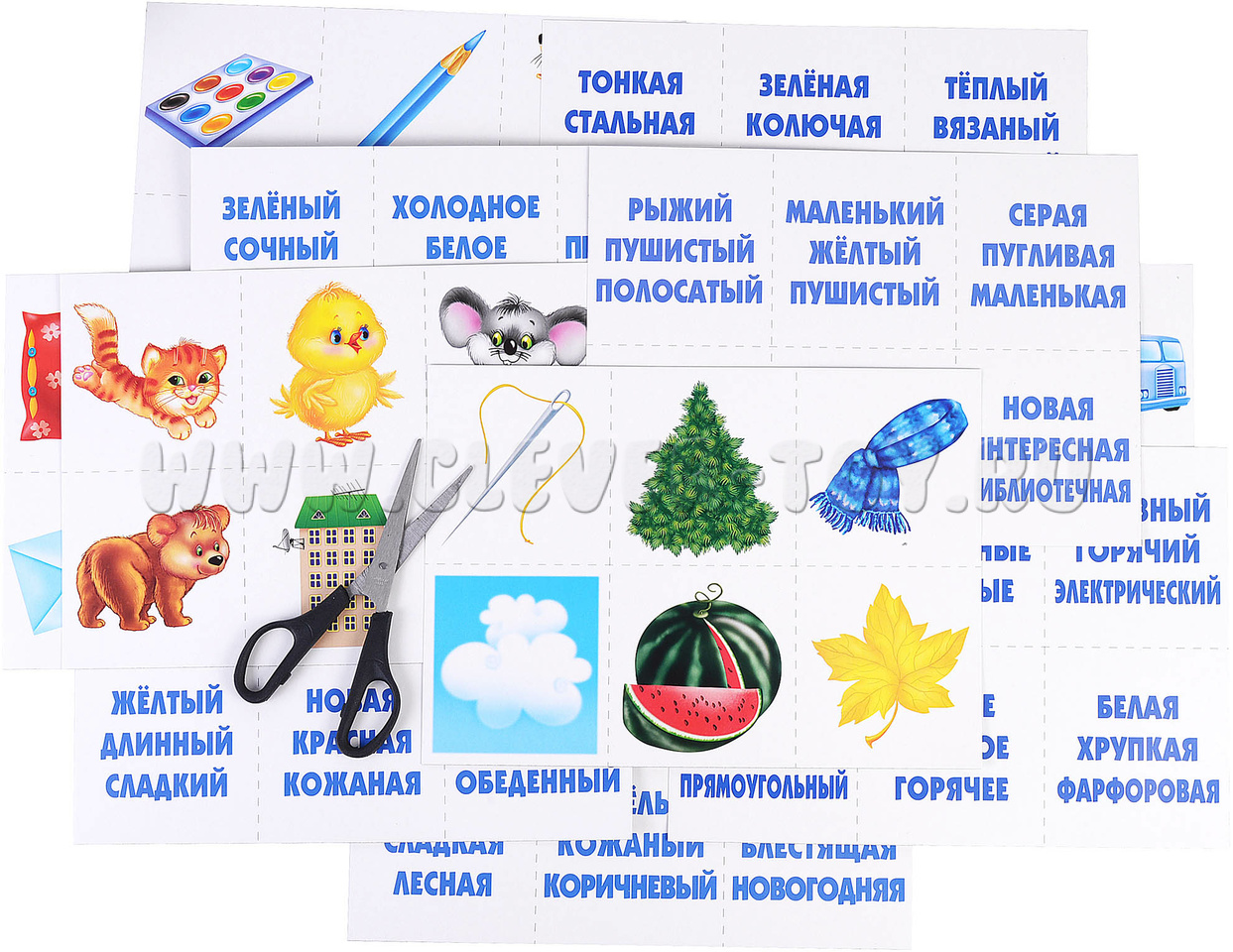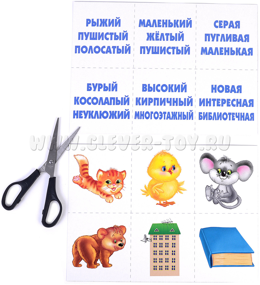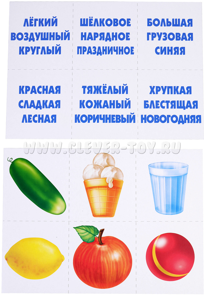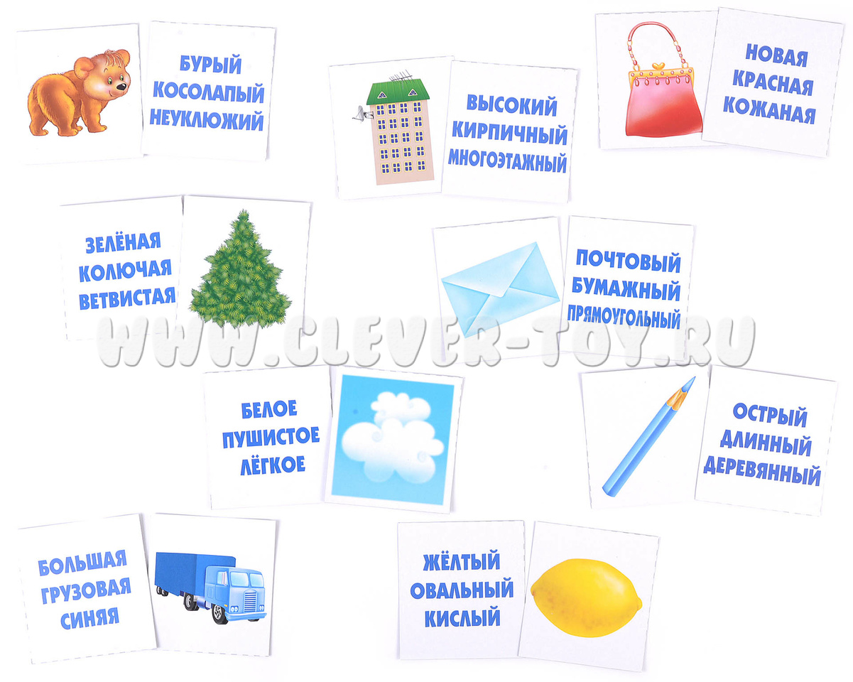 Количество: 6 разрезных карт с картинками (по 6 на каждой, всего 36 карточек) и 6 разрезных карт со словами (каждая картинка описывается 3 словами, на большой карте по 6 троек свойств, всего 36 карточек)