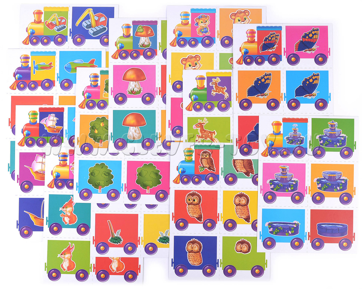 3. Разложите перед ребёнком несколько карточек с паровозиками. Пусть малыш их запомнит. Затем уберите 1–2 карточки, добавьте 1–2 новые и поменяйте их местами. Спросите ребёнка, что изменилось.