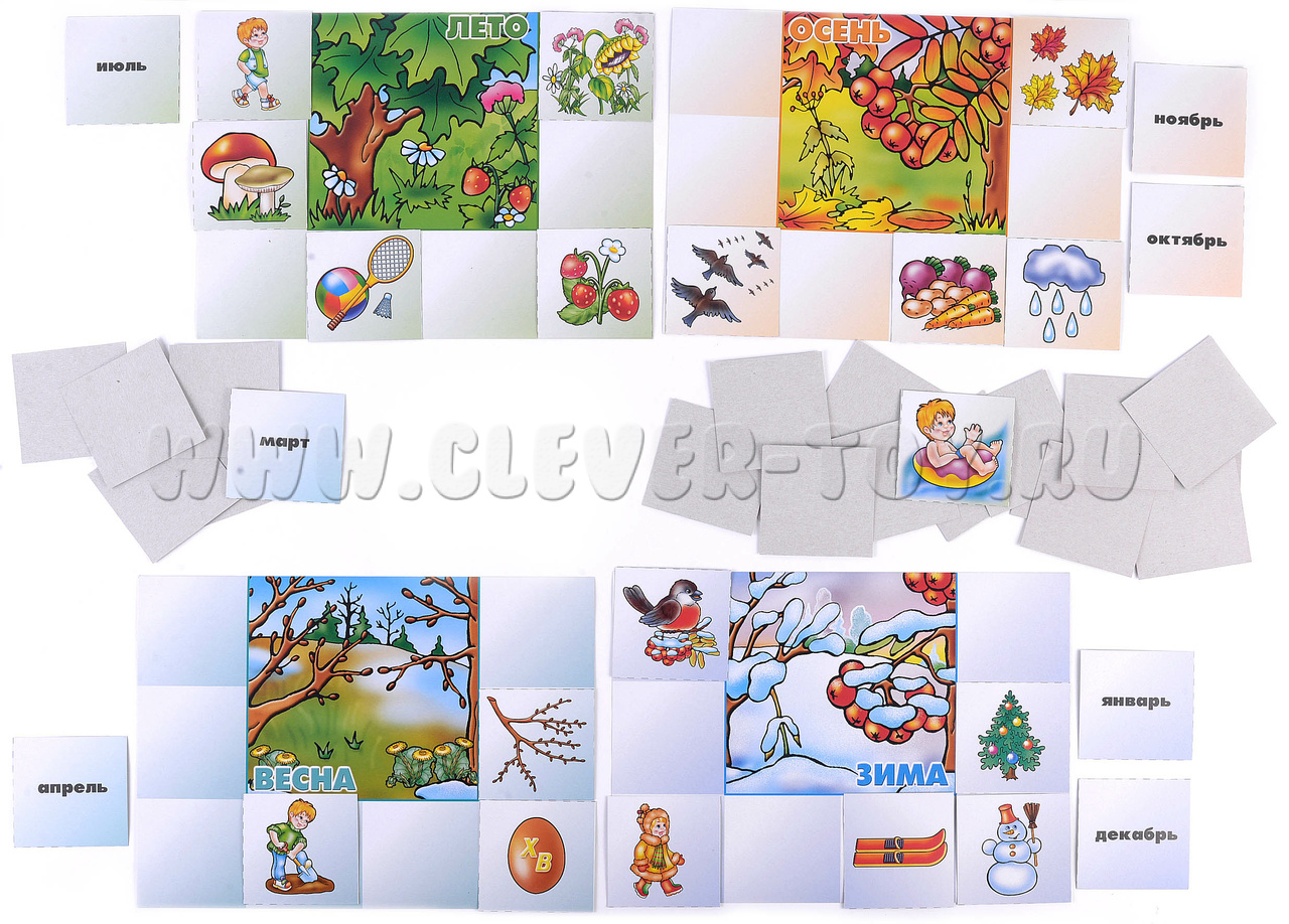 Перед началом игры родителю или педагогу необходимо разрезать карточки по пунктирным линиям. Большие карты (игровые поля) раздайте участникам поровну. 32 маленькие карточки с картинками перемешайте и выложите отдельно изображением вниз, так же поступите с карточками с названиями месяцев. По команде участники начинают выбирать из маленьких карточек подходящие к их игровым полям. Побеждает тот, кто сделал это правильно и быстрее всех остальных.