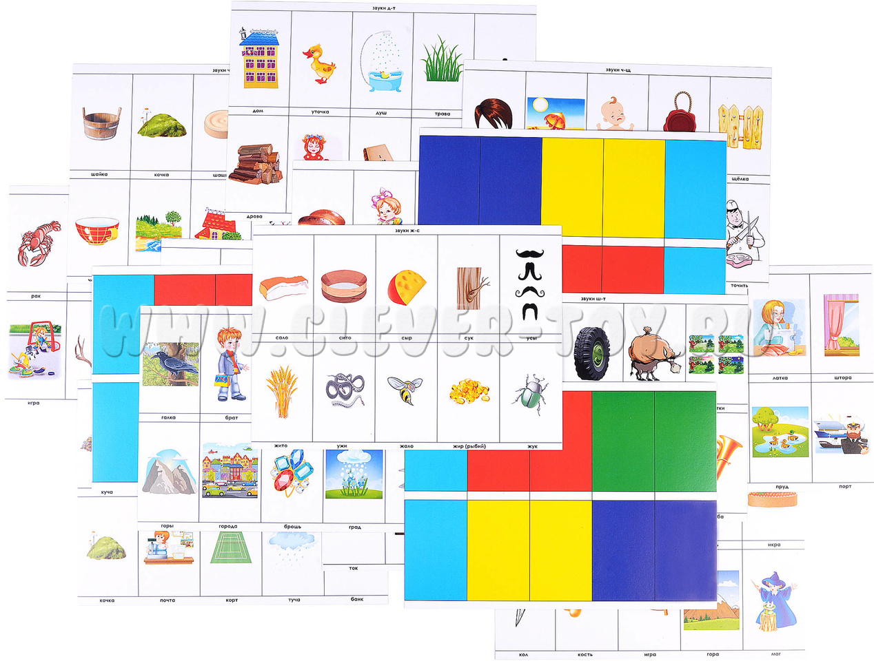 Набор включает в себя 14 игровых полей (5 пар слов с картинками на каждом) и 3 листа А4 с цветными разрезными карточками (используются в качестве вспомогательного материала при организации игрового процесса). Перед началом игры цветные карточки необходимо вырезать.
