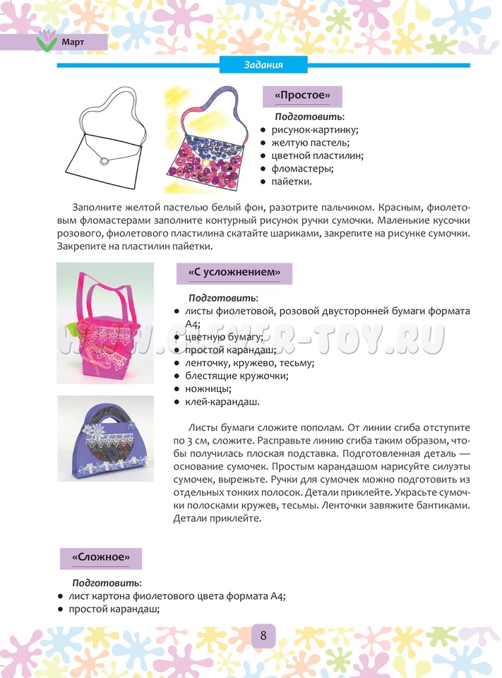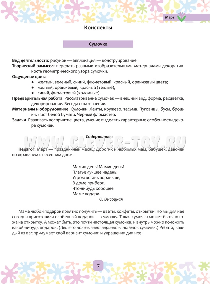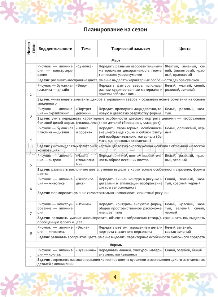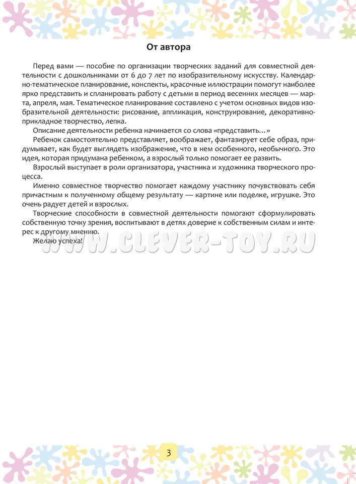 Книга содержит методические рекомендации по изобразительной деятельности, конспекты по совместной деятельности взрослого с детьми на период с марта по май включительно, наглядный материал для детей (6-7 лет) старшего дошкольного возраста. Пособие входит в авторскую программу «Цвет творчества», которая направлена на формирование художественных навыков и умений, развитие творческих способностей дошкольников в области цвета, графики и композиции.