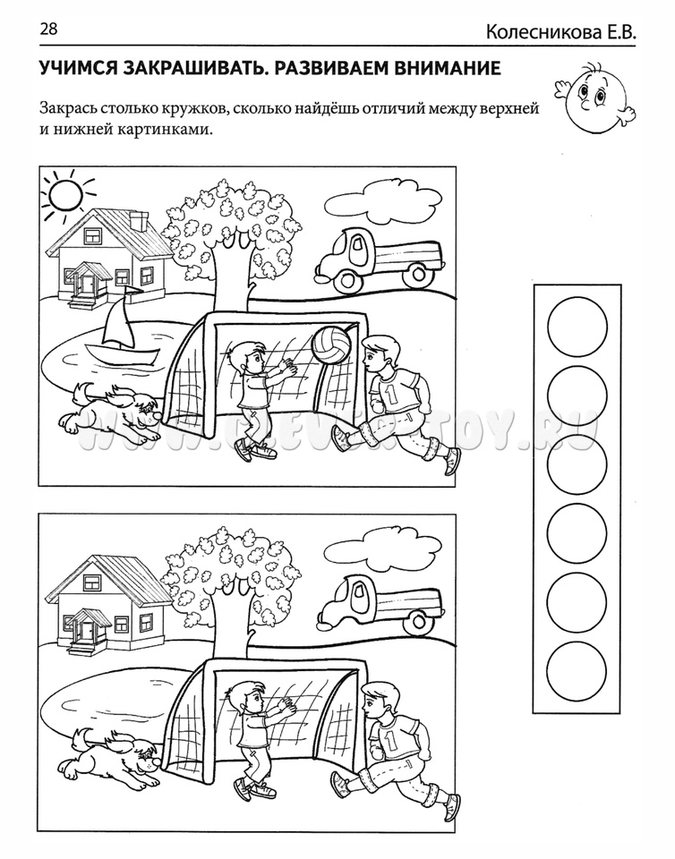 В возрасте 4 - 5 лет у детей начинают формироваться навыки самоконтроля и самооценки выполненной работы. На страницах тетради изображён смайлик Колобок без рта, который ребёнок должен нарисовать самостоятельно, оценив свою работу.