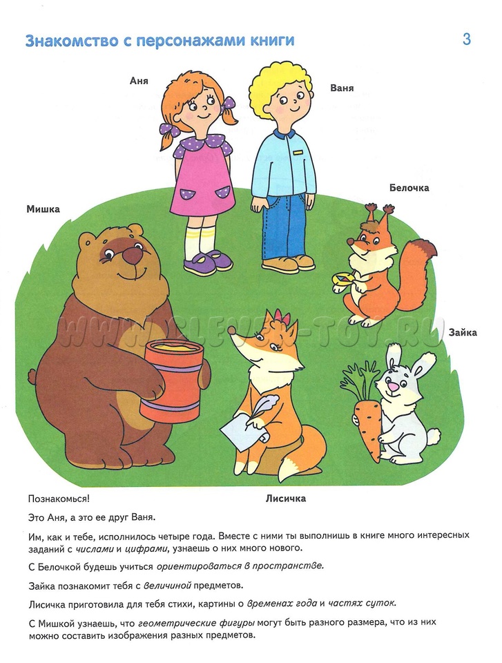 Также в тетради есть Условные обозначения, описанные на титульном листе и планируемы результаты в конце тетради, для оценки проделанной работы. Чтобы заинтересовать ребёнка выполнением заданий в рабочей тетради, она содержит персонажей: Аню, Ваню, Мишку (с заданиями по геометрии), Лисичку (задания о временах года и частях суток), Зайку (величина предметов) и Белочку (ориентация в пространстве).