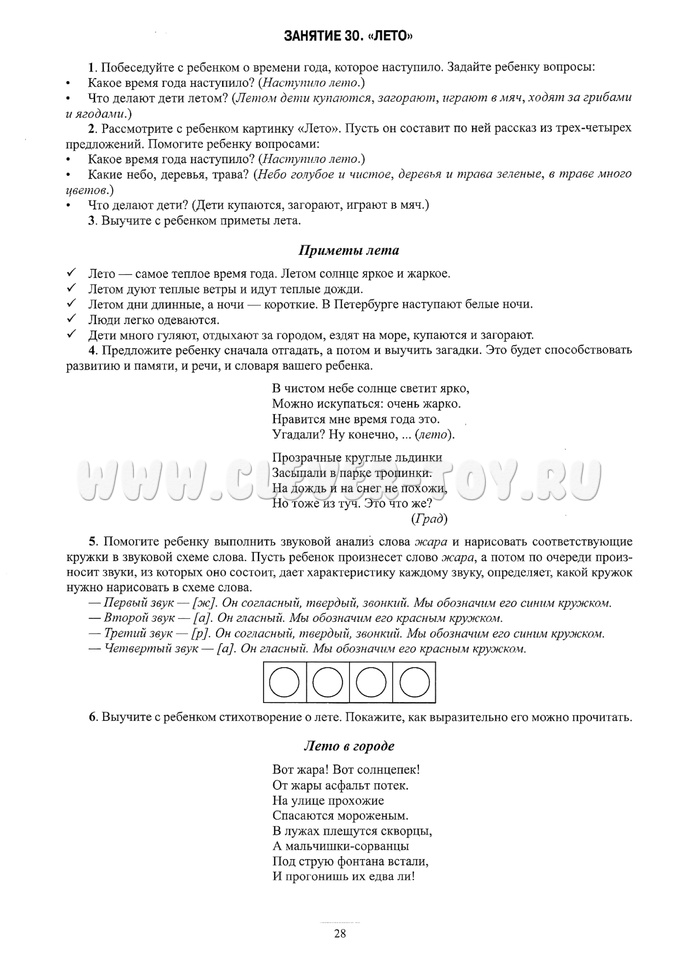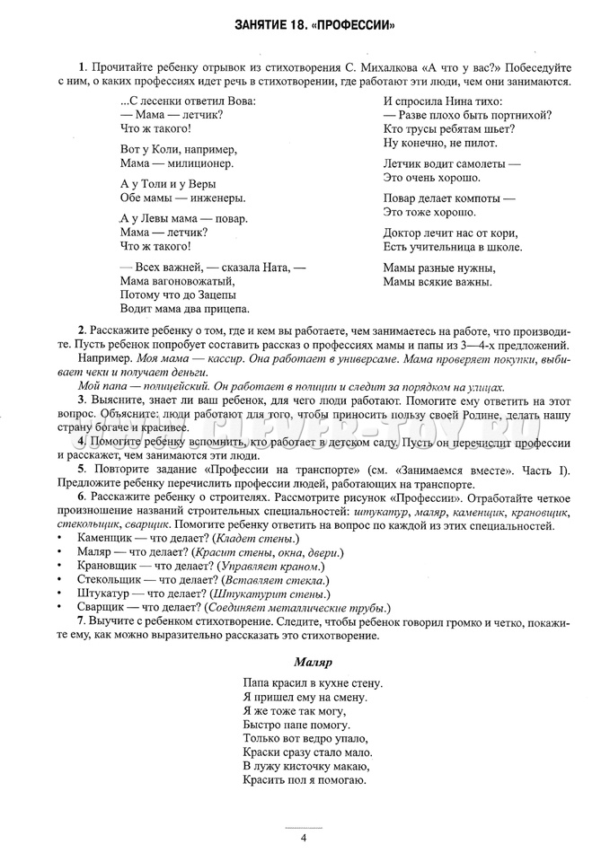 Каждое занятие рассчитано на неделю и содержит 6-8 заданий. Два первых задания позволяют определить состояние словаря ребенка и уровень развития его фразовой речи. Они предполагают проведение беседы с ребенком с опорой на картинки. В ходе беседы