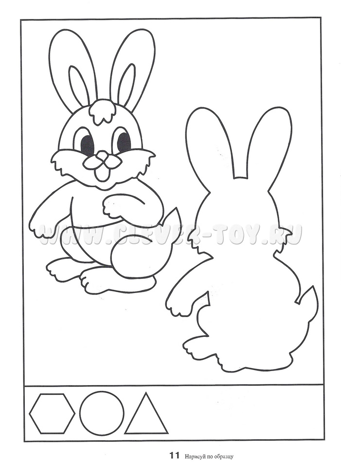 Задание для ребенка - воссоздать большой рисунок в первоначальном виде, срисовывая с образца. Внизу каждого листа есть маленькие рисунки, которые тоже необходимо полностью повторить.