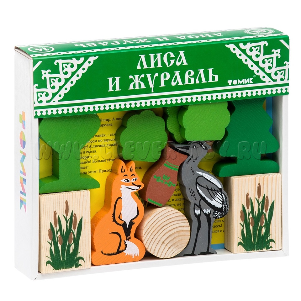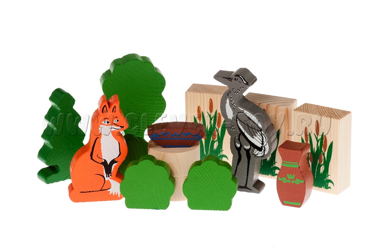 Конструктор выполнен из дерева, отшлифован и окрашен акриловыми красками для безопасной игры. В наборе представлено 14 деталей: лиса, журавль, три кустарника, три камыша, два бревнышка, пара деревьев, кувшин и тарелка. Купить конструктор можно в нашем магазине с доставкой в любой город России.