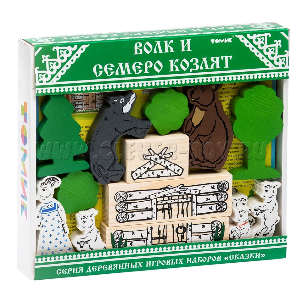 В набор входят деревянные модели персонажей и декорации сказки "Волк и семеро козлят" (всего 28 деталей), а также вкладыш с текстом сказки.