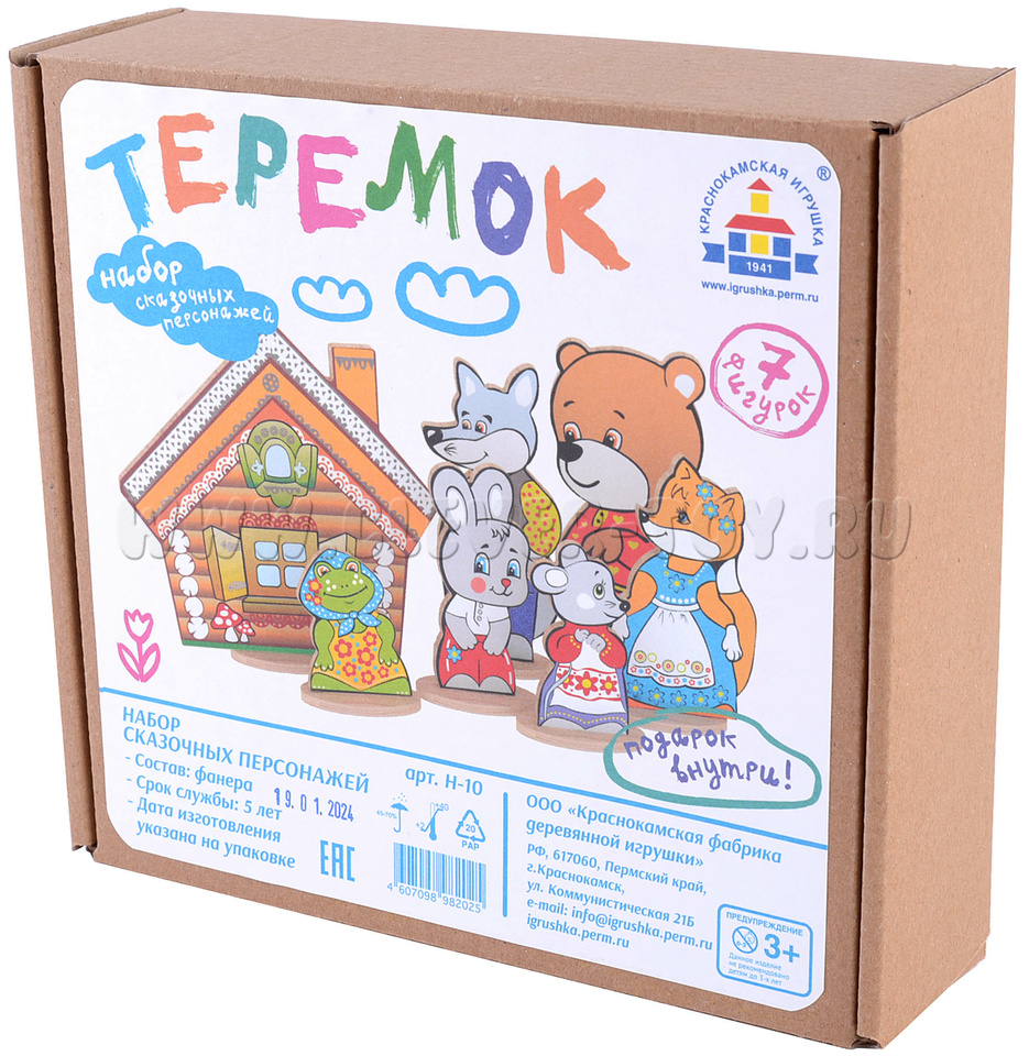 - 7 сказочных персонажей на подставках(заяц, мышка,лягушка, медведь, волк, лиса, теремок) от 6,5 до 12 см.;