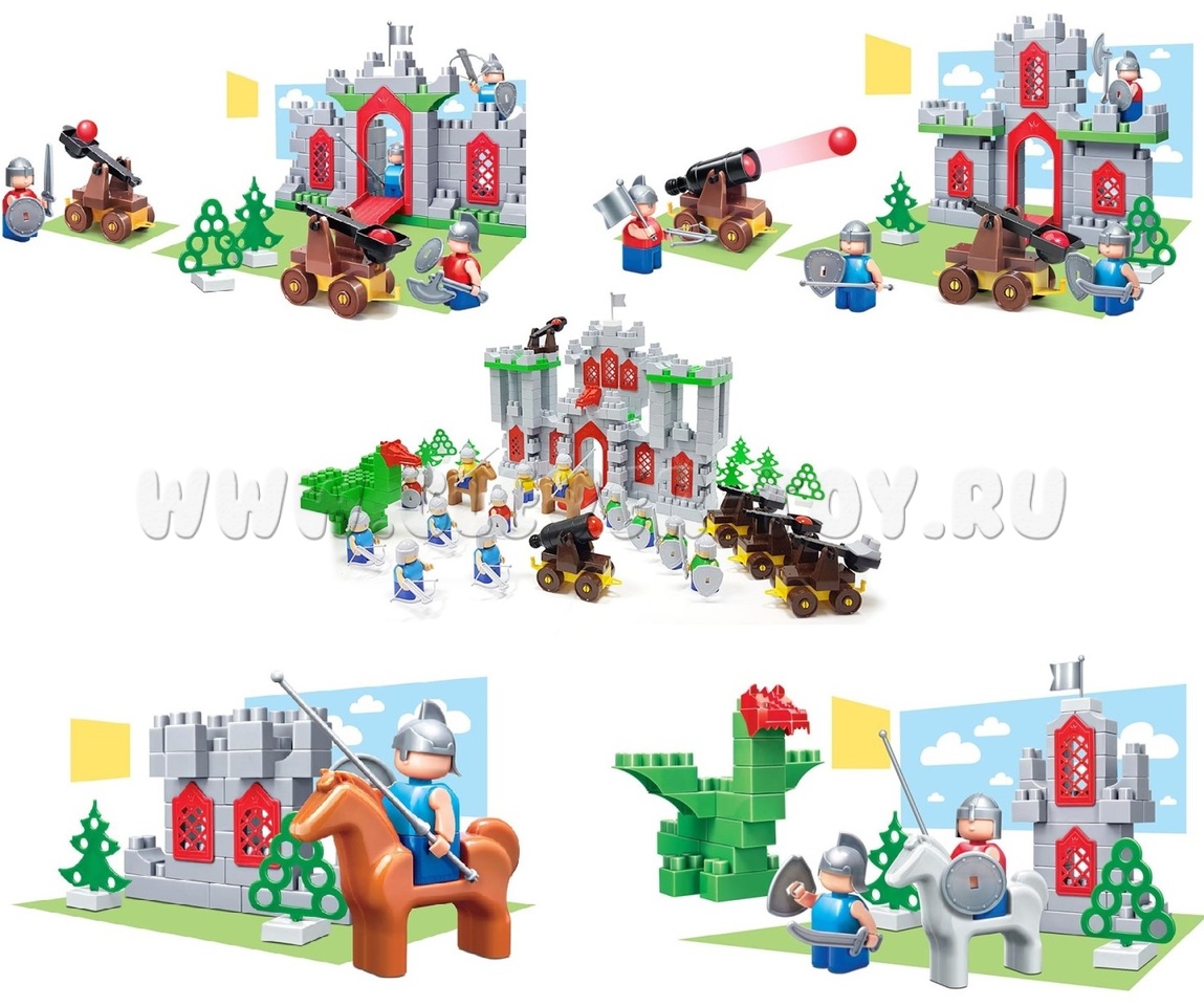 Детали конструктора выполнены из безопасного пластика, с использованием пищевых красителей и подходят как для самостоятельных игр, так и для занятий в коллективе. В набор входят кубики разных размеров и цветов, декоративные элементы, такие как деревья, крыши, окна, ворота, флаги, фигурки рыцарей, оружие и щиты, фигурки лошадей, сборные пушки и катапульты, ядра для стрельбы, фигура дракона.