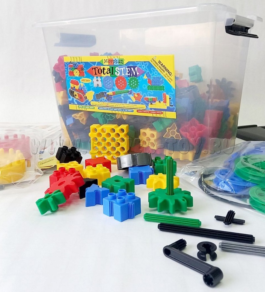 Конструктор Morphun Total STEM 480 деталей это не просто конструктор для STEM (Science, Technology, Engineering and Mathematics) образования детей, а полноценное практическое пособие для ознакомления детей с наиболее распространенными в инженерном деле механическими передачами, их свойствами и особенностями, понятием передаточное отношение, скорость вращения. В состав комплекта включено большое количество шестерен 5-и разных размеров, цевочные колеса, наборы для сборки реечной и цепной передачи, разноцветные детали 10 разных конфигураций, валы, фиксаторы, соединительные элементы разной формы, рукояти для вращения.