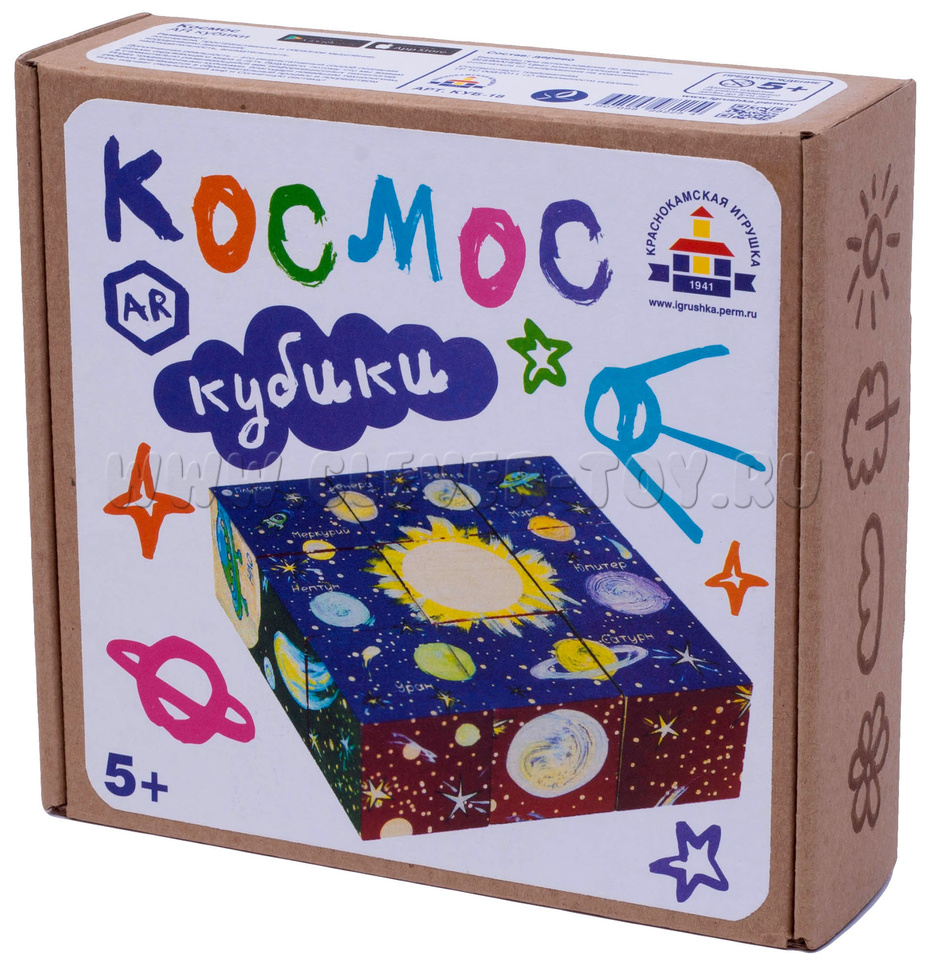 Из кубиков ваш ребёнок может собрать 6 изображений на космическую тему: "Солнечная система", "Луноход", "Спутник", "НЛО", "Восток", "Союз-Аполлон". Мобильное приложение для iOS и Android распознает каждое правильно собранное изображение, и перед глазами ребёнка чудесным образом появляется анимированная 3D модель Солнечной системы. Каждый элемент этого интерактивного представления активен: нажав на любую планету, ракету, спутник, родители и дети узнают интересные факты о жизни планет и устройстве космических кораблей.