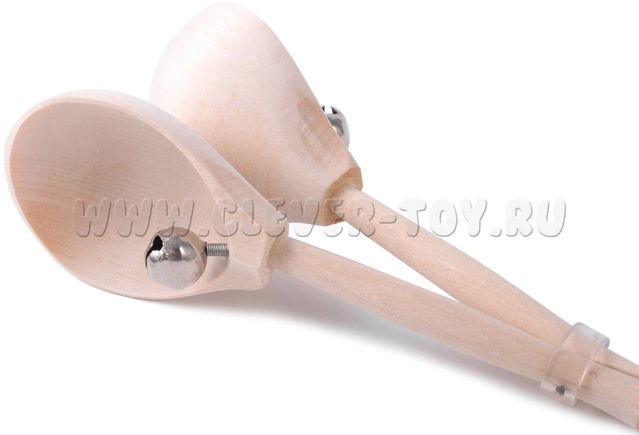 Две деревянные ложки соединены вместе с помощью хлорвинилового кольца диаметром 20 мм. Хвостовики черенков сточены под углом в 45 градусов. В задней части черенков вмонтирован скрытый шип. В каждый из черпаков с наружной стороны вклеено по одному бубенчику. Материал: береза.