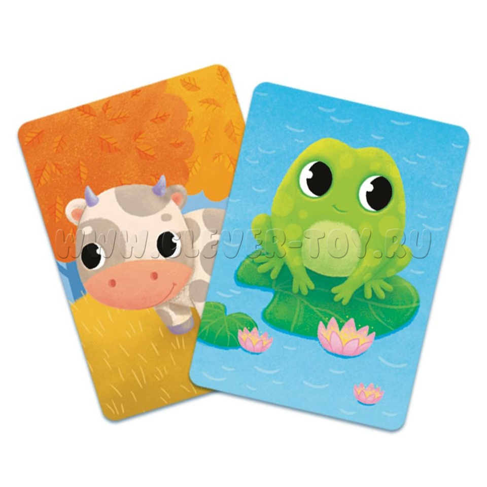 - 30 карточек с изображением животных, всего в колоде 15 совпадающих пар карточек (ёжик, корова, леопард, обезьянка, лягушка, лисичка, львёнок, олень, осьминог, барашек, пингвин, зайчик, сова, поросёнок, попугай);
