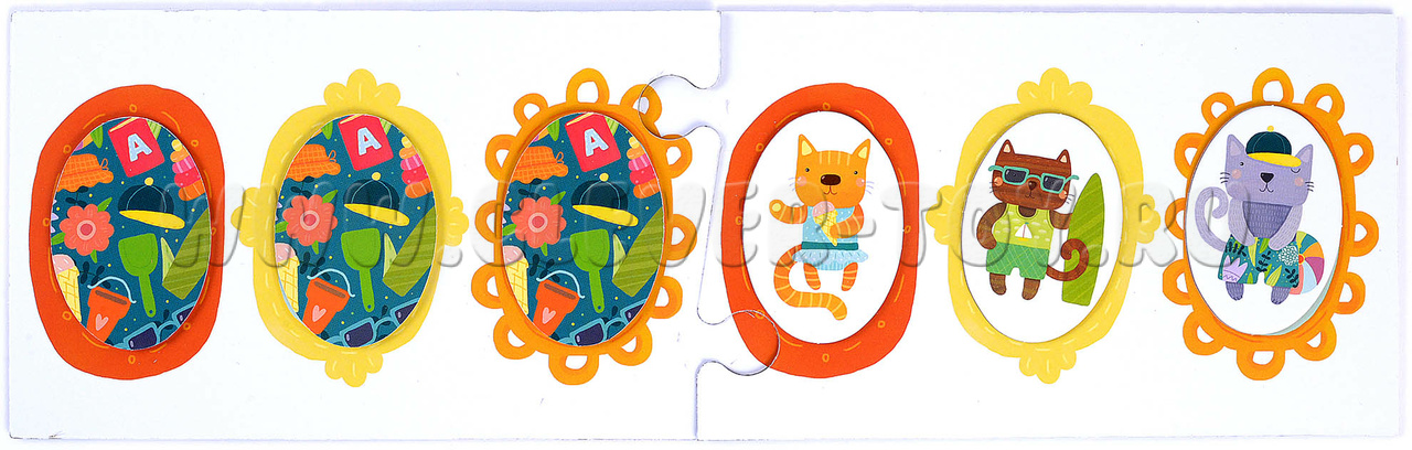- Игра на поле с рамками. Составное игровое поле разделено на 2 части, в каждой из них по 3 портретные рамки. Распределите фишки с котятами поровну так, чтобы и у вас, и у ребенка на руках оказались одинаковые комплекты. Выложите на своей части поля любую случайную последовательность из 3 фишек. Предложите малышу выложить такую же на своей половине игрового поля. Игру можно усложнить, если предложить ребенку запомнить составленную вами последовательность и воспроизвести ее по памяти;