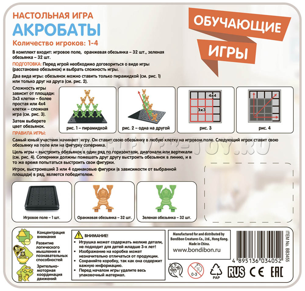 3D крестики-нолики нового поколения! Первый игрок ставит свою обезьянку в любую клетку на игровом поле, а следующий - на поле или на фигурку соперника. Нужно выстроить обезьянок в один ряд по горизонтали, вертикали или диагонали. Побеждает игрок, выстроивший 3 или 4 фигурки в ряд. 2 вида игры и 2 уровня сложности.