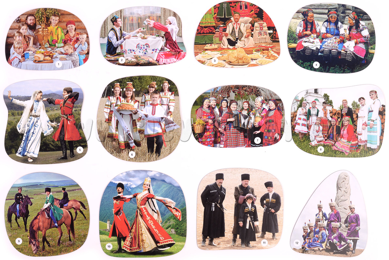 В наборе 23 магнитных карточки, которые рассказывают, о разных народах, проживающих в нашей стране.