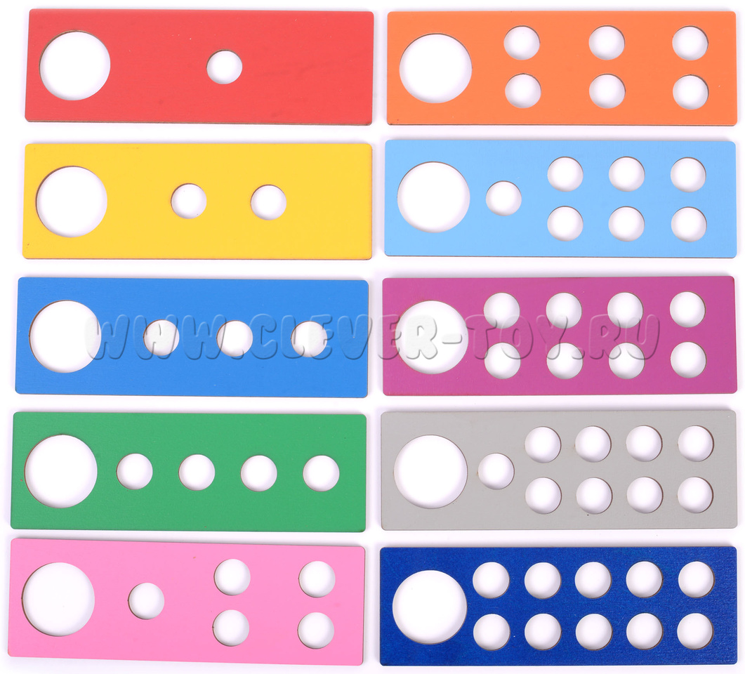 1. Сортируйте кружки по цветам, вкладывайте их в отверстия с учетом цвета дощечки;