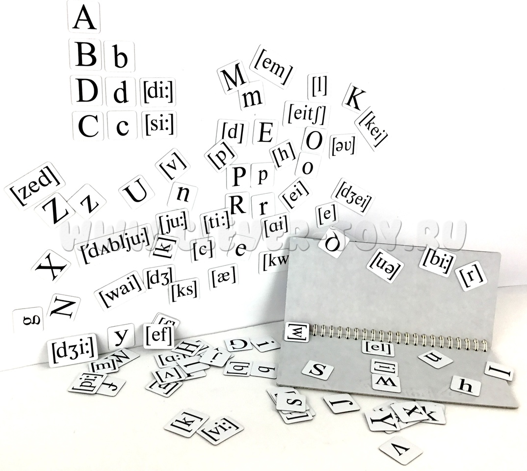 Набор магнитных карточек для изучения английского алфавита и транскрипции. Каждая карточка содержит как печатную букву, так и её транскрипцию, что помогает детям быстрее освоить произношение.