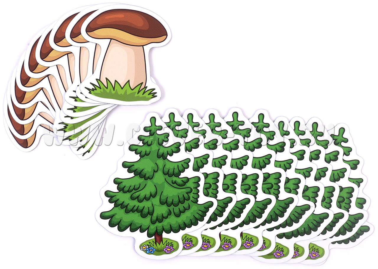 В наборе двадцать магнитных карточек: 10 ёлочек и 10 грибов. Карточки гнутся и не ломаются, моются под краном.