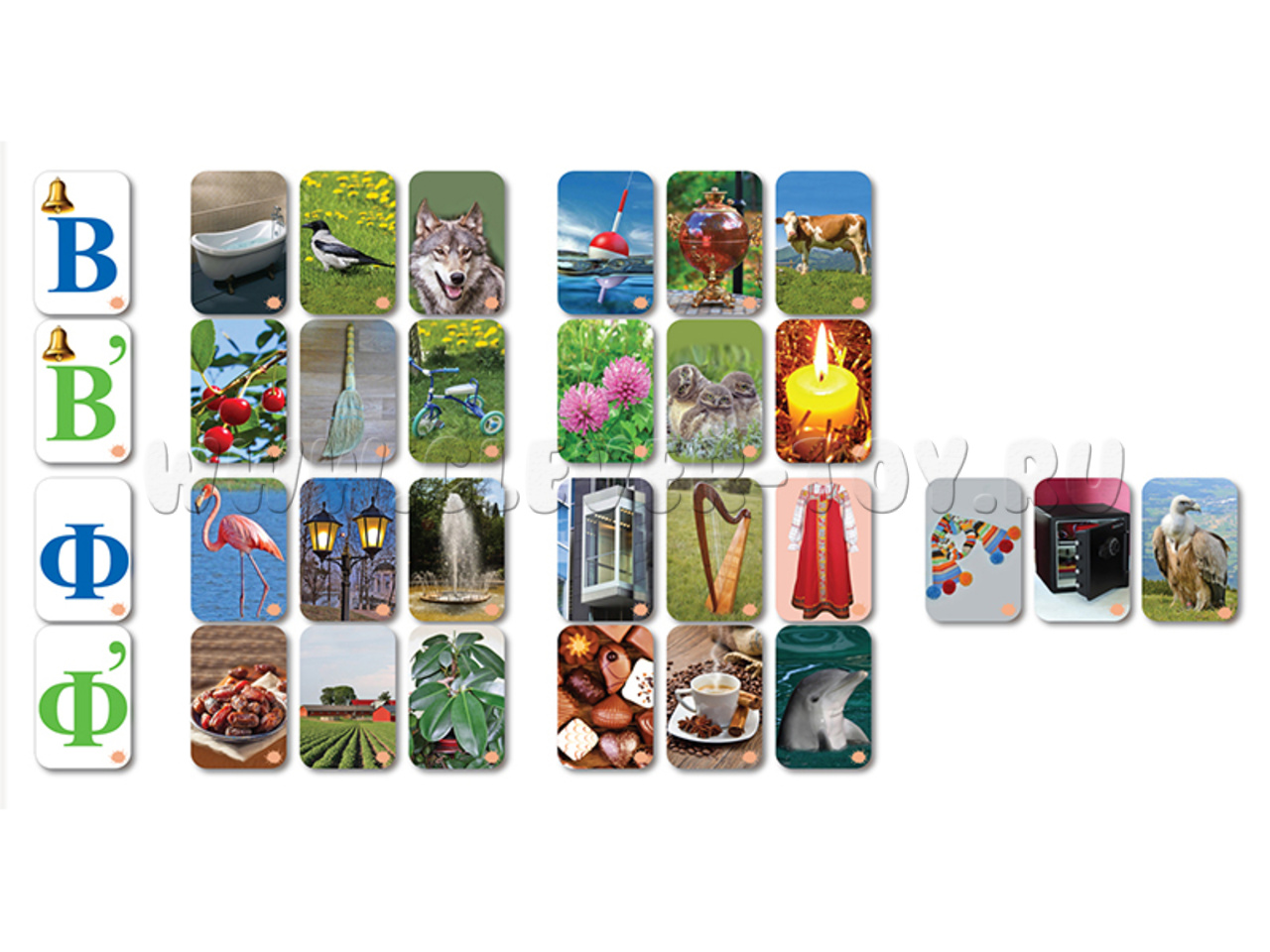 В, Ф, Ванна, Ворона, Волк, поплавок, самовар, корова; Фламинго, Фонарь, Фонтан, лифт, арфа, сарафан, шарф, сейф, гриф; Вишня, Веник, Велосипед, клевер, совята, свеча; Финики, Ферма, Фикус, конфеты, кофе, дельфин.