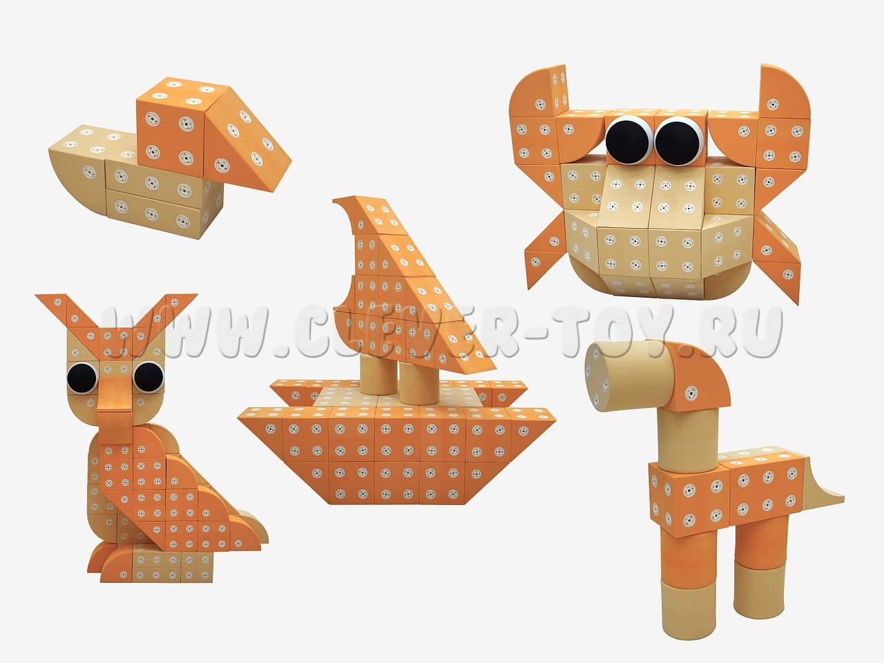 Напольный конструктор выполнен в двух цветах.Крупные детали в виде геометрических фигур выполнены из мягкого гипоаллергенного материала. Крепления имеет магнитную систему для быстрой и простой стыковки-расстыковки деталей. У каждой детали есть от 4 до 24 вариантов магнитной стыковки, что дает полную свободу для творчества.