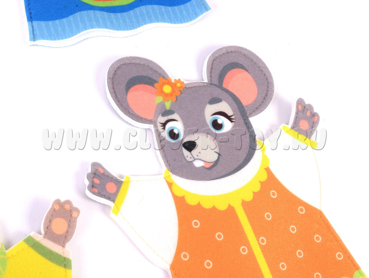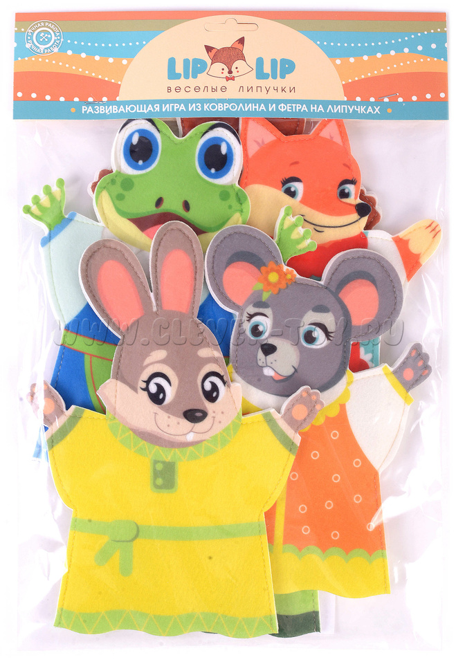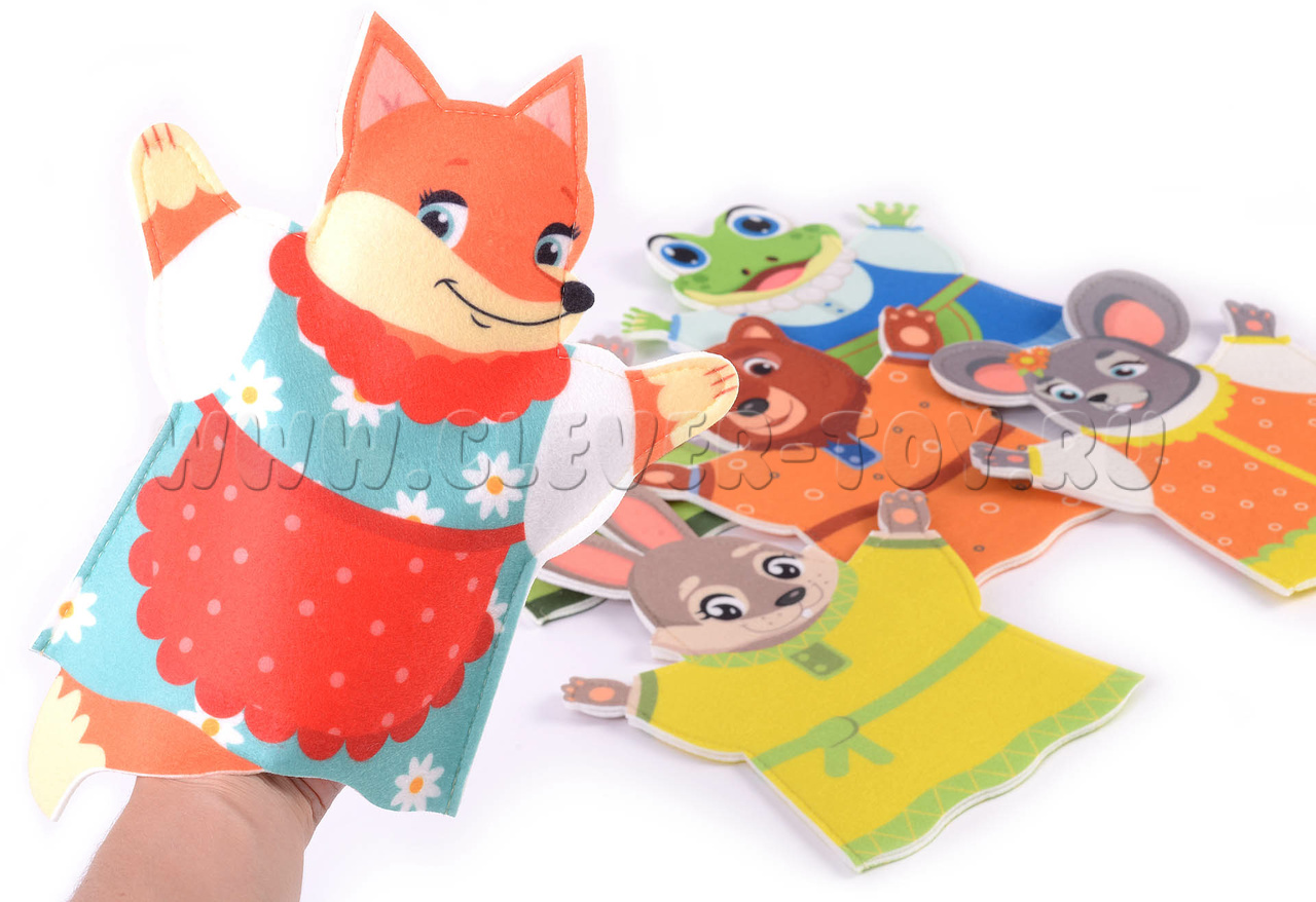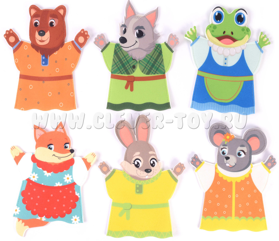 Шесть персонажей из сказки теремок на руку. Лягушка, волк, лиса, медведь, заяц, мышка. Фигурки 23 см.