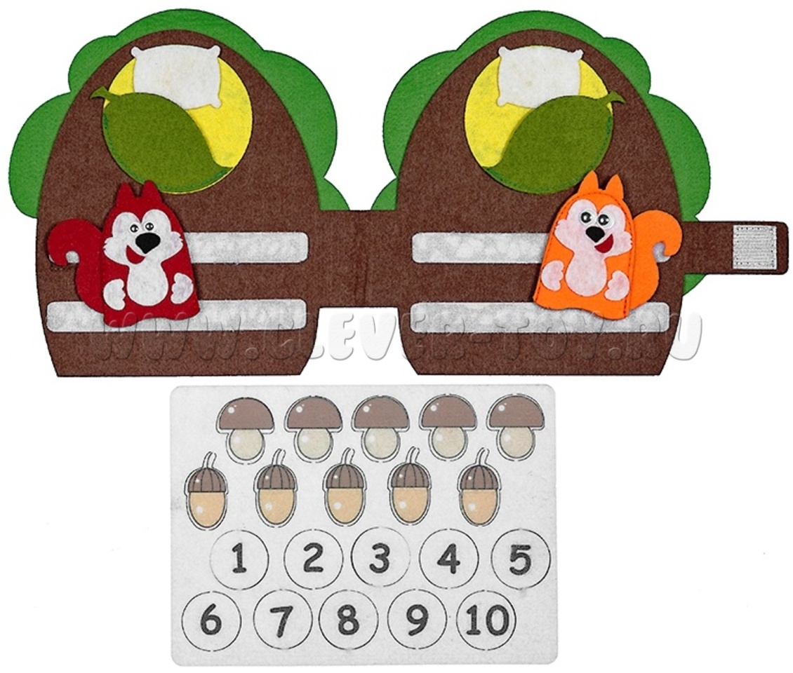 4. Учите малыша работать по речевой инструкции. Например, положи белке слева три грибочка, а белке справа 2 желудя.