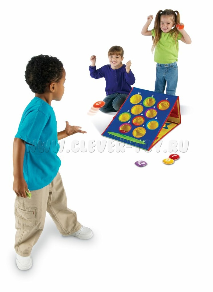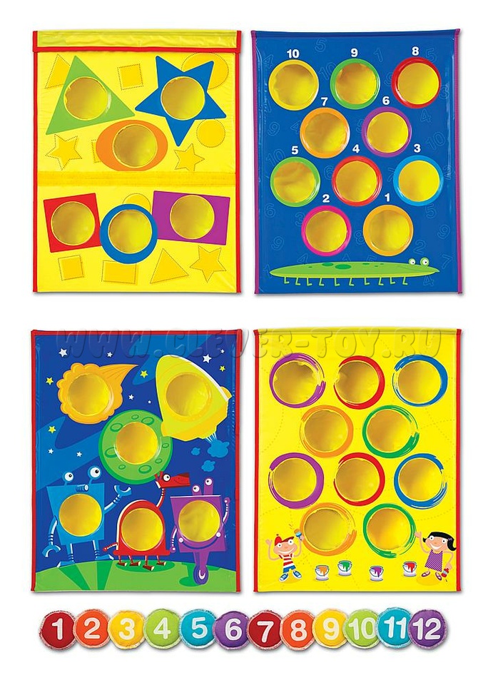 Набор позволяет быстро и легко настраивать и изменять игру: сопоставлять цвета, фигуры или цифры, бросая игровые мешочки в отверстия или проявить фантазию и придумать свой вариант игры.
