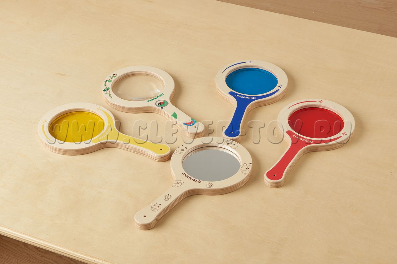 С этим набором можно заниматься научными наблюдениями и исследованиями, а также по-новому взглянуть на окружающий мир. Если поднести к глазу одну из цветных луп, то всё вокруг окрасится в разные цвета. Если поднести две лупы к глазу одновременно, то получится новый цвет. Двустороннее плоское зеркало позволяет детям наблюдать и изучать свои эмоции, а увеличительная лупа подходит для детального изучения мелких предметов или, например, насекомых (с 3-кратным и 5-кратным увеличением).