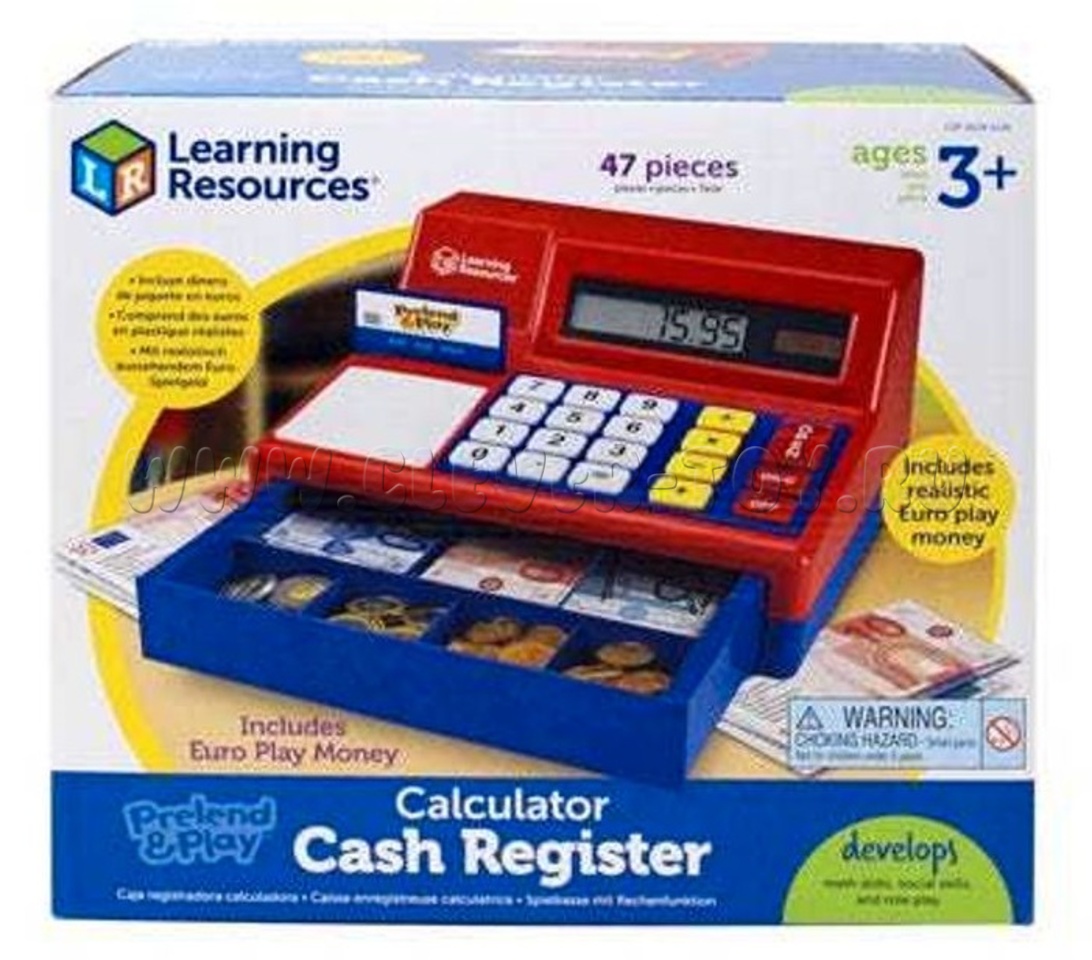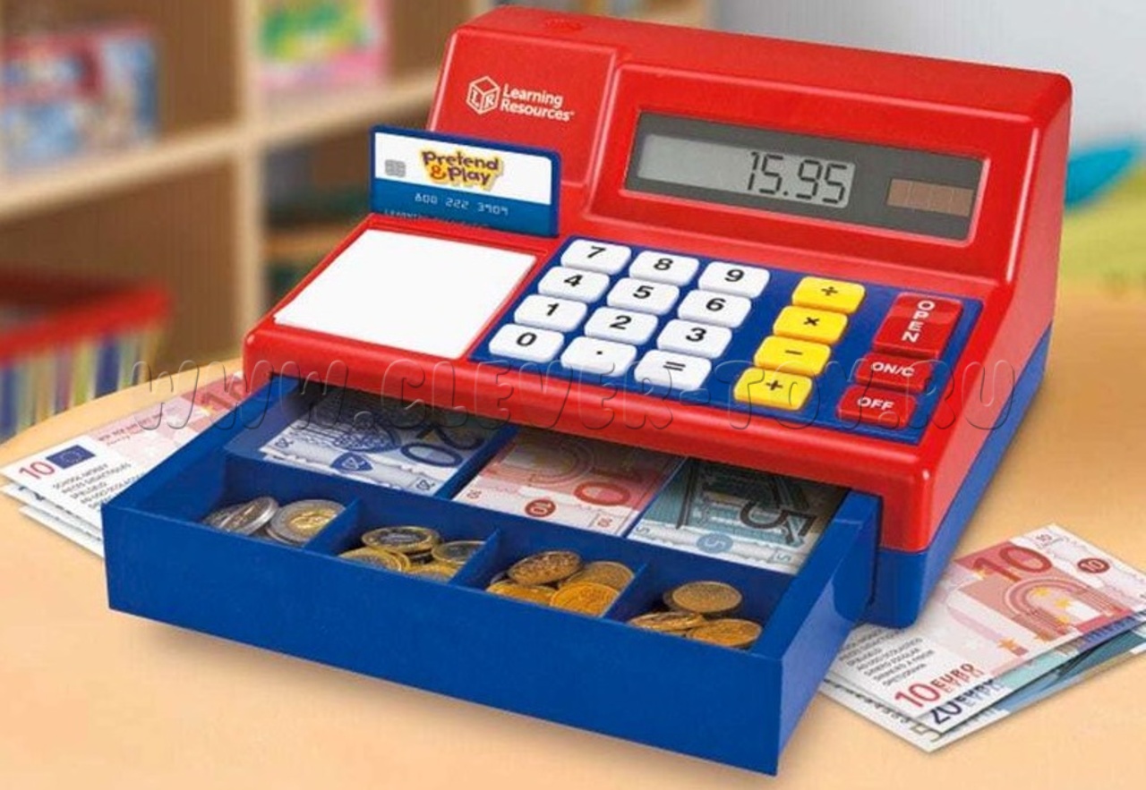 Игрушечный кассовый аппарат с рабочим денежным ящиком и калькуляторм на солнечной батарее.