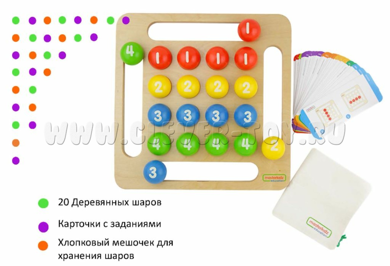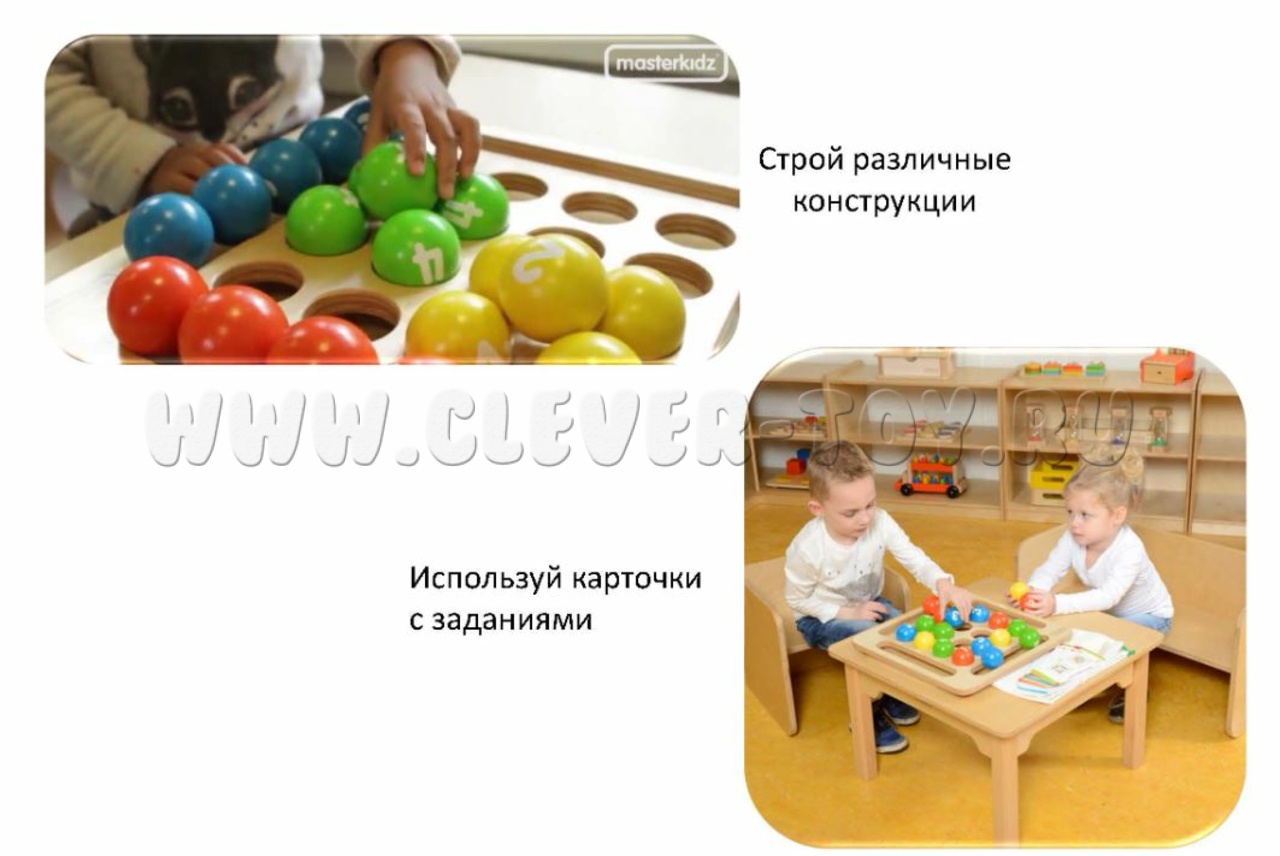 Детям предлагается расположить шары на панели по цвету, в цифровой последовательности или в виде узоров в свободной форме. Используя карточки с заданиями можно создавать объемные фигуры.