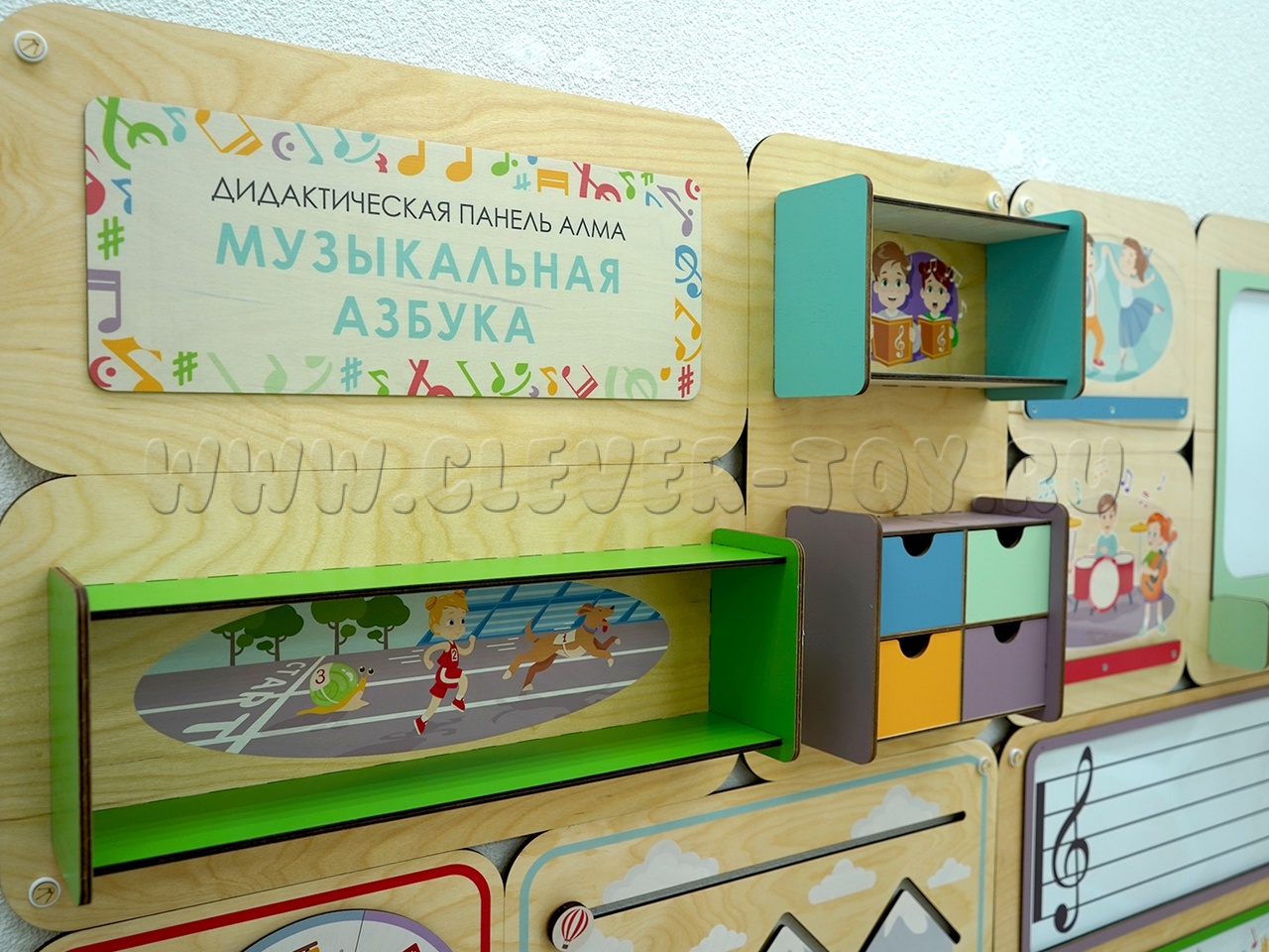 Модуль "Нотки-магнитики" с комплектом магнитов в форме нот знакомит детей со способом записи мелодии и элементарной нотной грамотой. Элемент панели можно использовать для пения, слушания музыки, игры на музыкальных инструментах.